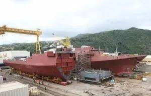 9、二层底分段艏艉分段大合拢,边箱分段合拢的对接缝要用低氢型(碱性)焊条或用相同级别的 711、712 的 CO2 焊丝对称焊接,一次性连续焊完;